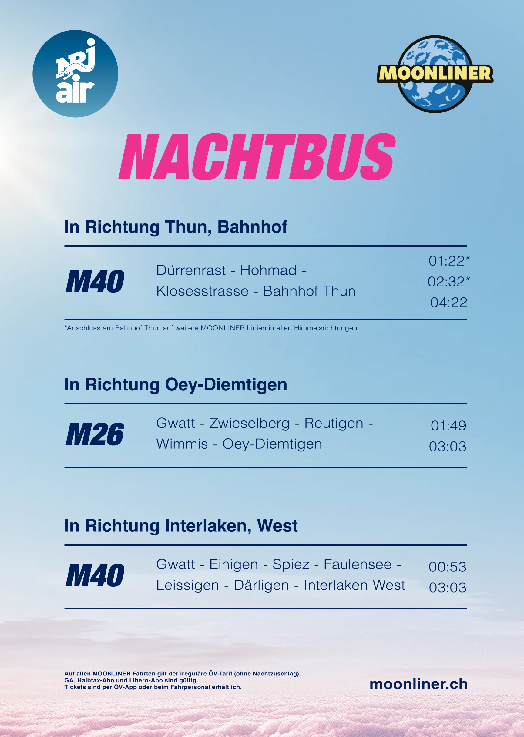 Nach der Show ist vor der Party! Feiere mit uns an der offiziellen Energy Air Aftershowparty im Seepark Hotel durch die ganze Nacht. Das Beste: Mit deinem Energy Air Ticket erhältst du 66% Rabatt auf dein Aftershowparty Ticket. Auch wenn du nicht am Energy Air selbst dabei bist, kannst du an der Aftershowparty teilnehmen, Tickets dafür gibt’s für CHF 30. Als Energy Air Besucher*in erhältst du dein Ticket zum exklusiven Vorzugspreis von nur CHF 10. Busse stehen zur Verfügung. Schnapp dir jetzt dein Ticket und sei dabei, wenn in Thun die grosse Party in die Verlängerung geht.